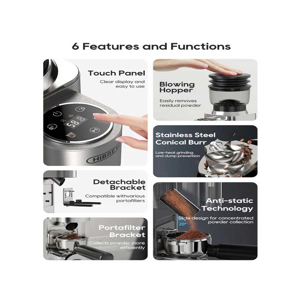 Ο μύλος καφέ HiBREW G7 διαθέτει μια διαισθητική ψηφιακή οθόνη αφής για εύκολη διαχείριση. Οι χρήστες μπορούν εύκολα να επιλέξουν τρόπους άλεσης, να προσαρμόσουν τις ρυθμίσεις και να παρακολουθήσουν τη διαδικασία άλεσης, προσφέροντας μια ακριβή και φιλική προς τον χρήστη εμπειρία.